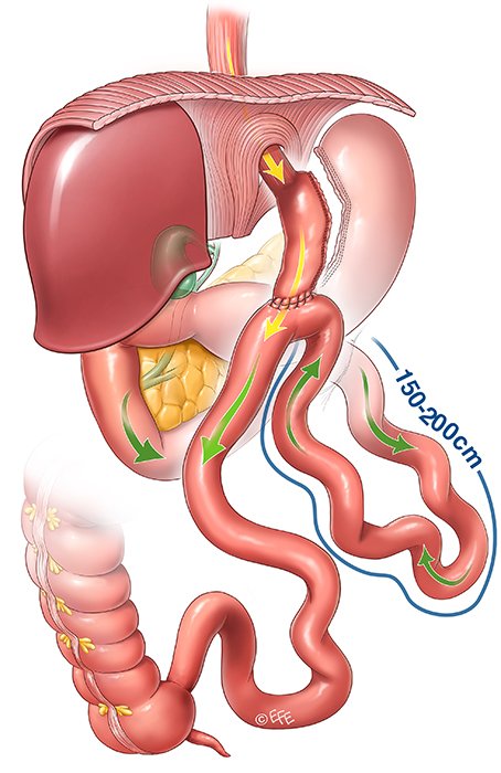 Nel mini bypass gastrico tutto il cibo è deviato nell'intestino, ed una parte